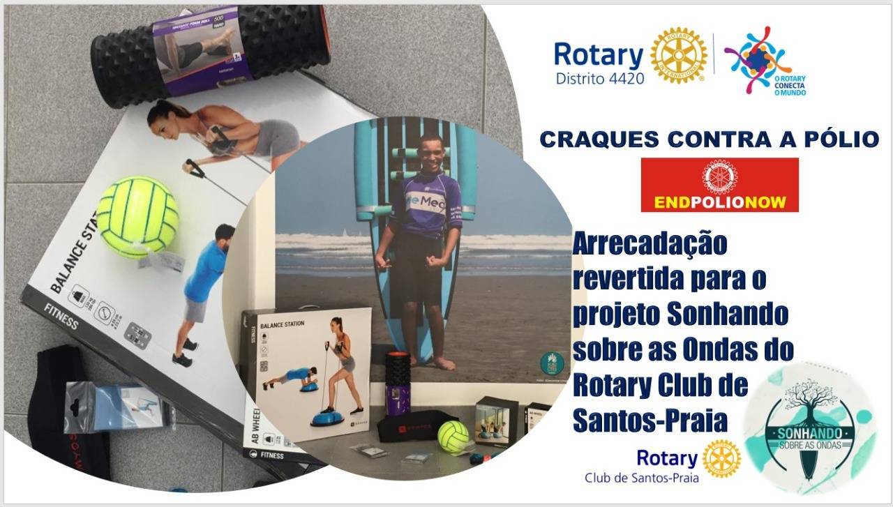 A arrecadação de 50% dos convites vendidos através do Rotary Club de Santos-Praia do evento “Craques contra Pólio” do Distrito 4420, foi finalizado com a aquisição de materiais destinados ao projeto “Sonhando sobre as Ondas – Internacional”.